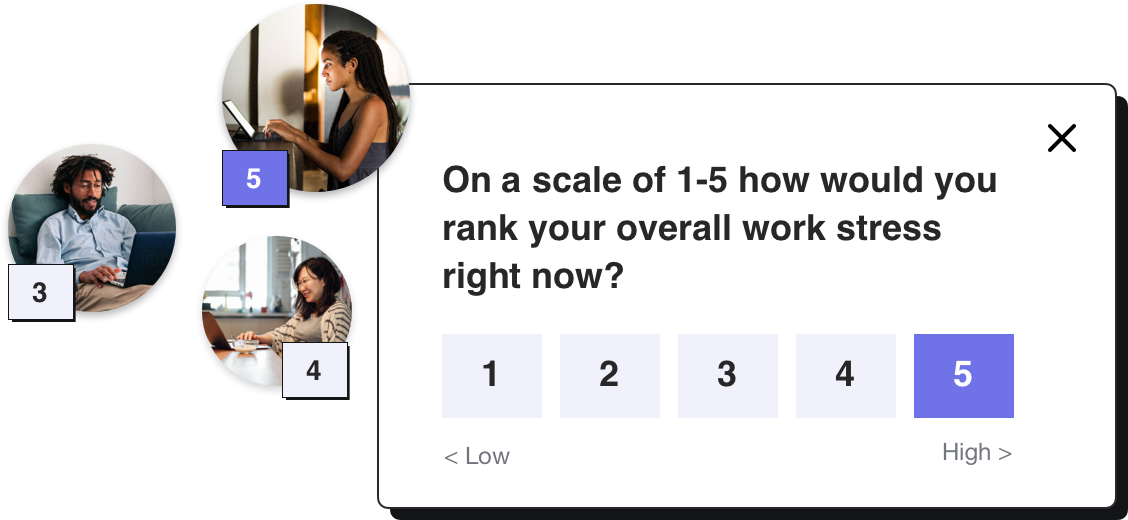 A weekly check-in contains 7–10 questions and takes less than two minutes to complete. As these are conducted in a pulse survey framework, check-in questions will come up again every 3 months because it’s important to be able to measure change and quantify trends for every Index.